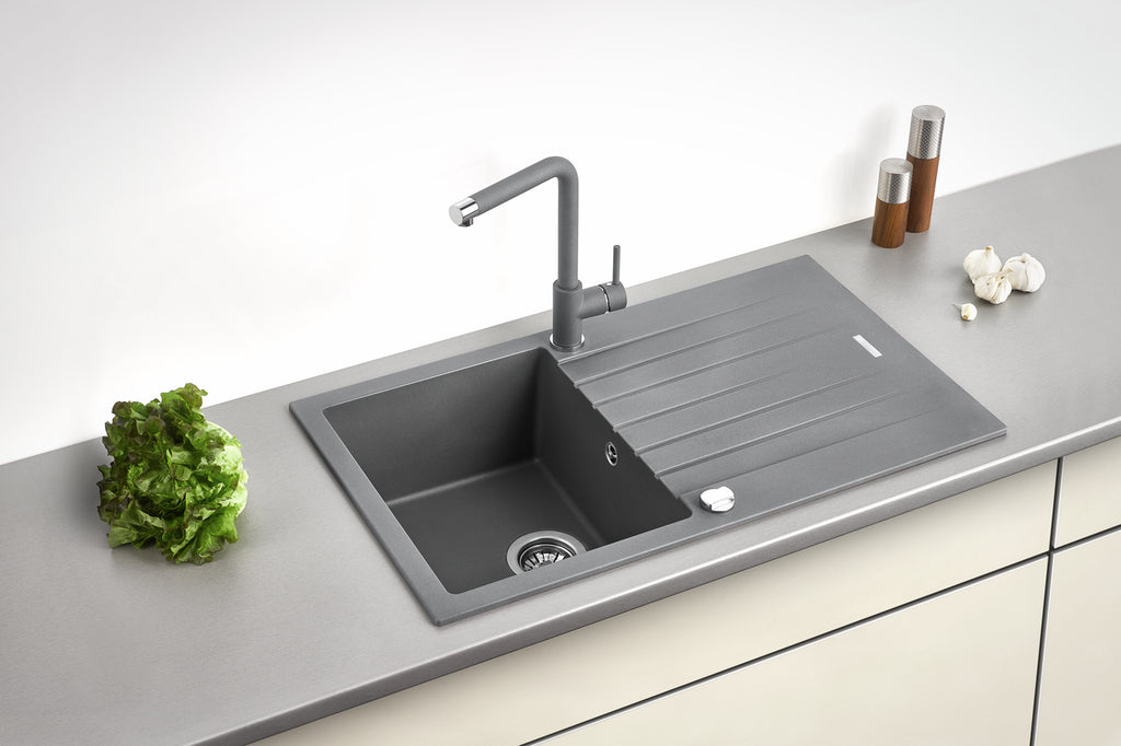 Die Composite-Einbauspüle Angola 100 mit ihren konturenscharfen Linien ist ein Highlight, das jede Einbauküche stilvoll aufwertet. Mit ihrer Granit-Optik fügt sie sich in viele Küchen ein. Die geriffelte Abtropffläche mit ihren großzügigen Maßen kann sowohl zur Ablage des Kochgeschirrs als auch mit passendem Zubehör als weitere Arbeitsfläche genutzt werden. Der zur Fertigung der Spüle verwendete Verbundwerkstoff zeichnet sich durch seinen hohen Quarzanteil aus. Dieser ist robust, langlebig und punktet mit seiner Haptik. Ein zusätzlicher Vorteil sind die pflegeleichten Eigenschaften. Dank des Materials kann die Spüle mit einer Heißwasser-Armatur bis 100 °C genutzt werden. Zur Ausstattung der Spüle zählt das verchromte Korbventil mit zugehöriger Drehexzenter-Garnitur. Beidseitig eingearbeitete Bohrungen erlauben es, die Küchenspüle wahlweise mit dem Becken auf der linken oder rechten Seite einzubauen. Passend zur Serie mit ihrer Farbpalette im Granit-Look stehen diverse Hochdruck-Armaturen zur Auswahl, um das Gesamtbild abzurunden.