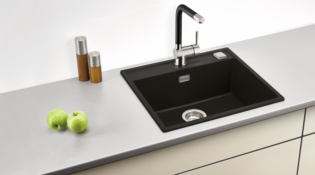 Mit der Einbauspüle Angola 56 im Set inklusive Einhebelmischer entsteht ein widerstandsfähiger Spülplatz, der sich durch Qualität, Komfort und modernes Design auszeichnet. Die klare Linienführung und die eleganten Granit-Farben schaffen ein Highlight in Küchen aller Stilarten. Ausgestattet mit einer tiefen Armaturenbank bietet die Einbeckenspüle den idealen Standort für die zum Set gehörende Drive 15 Hochdruck-Armatur. Diese verfügt über einen hohen Auslauf mit seitlichem Einhebelmischer und Keramikkartusche sowie einen weiten Schwenkbereich von 360°. Gefertigt ist die Spülarmatur aus robustem Edelstahl mit schwarzem Finish. Das pflegeleichte Composite-Spülbecken besteht aus Cin-Nagranit. Dabei handelt es sich um einen widerstandsfähigen Kunststein, der durch seine wasser-, kratz- und fleckenfesten Eigenschaften besticht und sich auch für die Verwendung mit Heißwasser-Armaturen (+/-100 °C) eignet. Dank des Flachrands kann der Einbau wahlweise von oben oder flächenbündig in die Arbeitsplatte erfolgen. Insgesamt sind fünf Vorbohrungen integriert, die beim Einbau durchgeschlagen werden müssen. Komplettiert wird die Ausstattung durch ein verchromtes Siebkorbventil mit Drehexenter-Garnitur sowie einem Ab- und Überlaufset.
