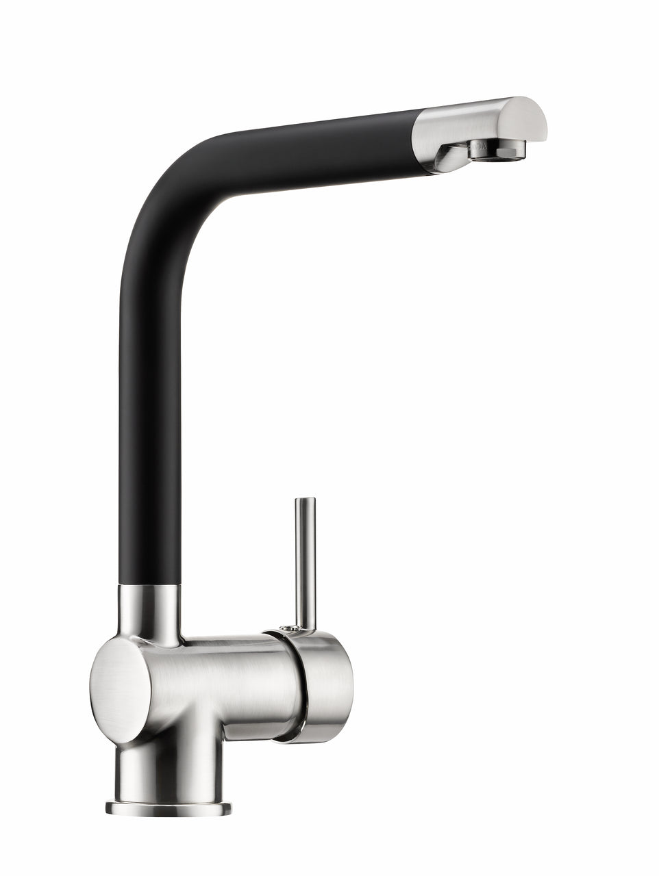Einhebelmischer. Mit schwenkbarem Auslauf, edelstahlfarbig/schwarz, seitlichem Hebel und Keramikkartusche.
