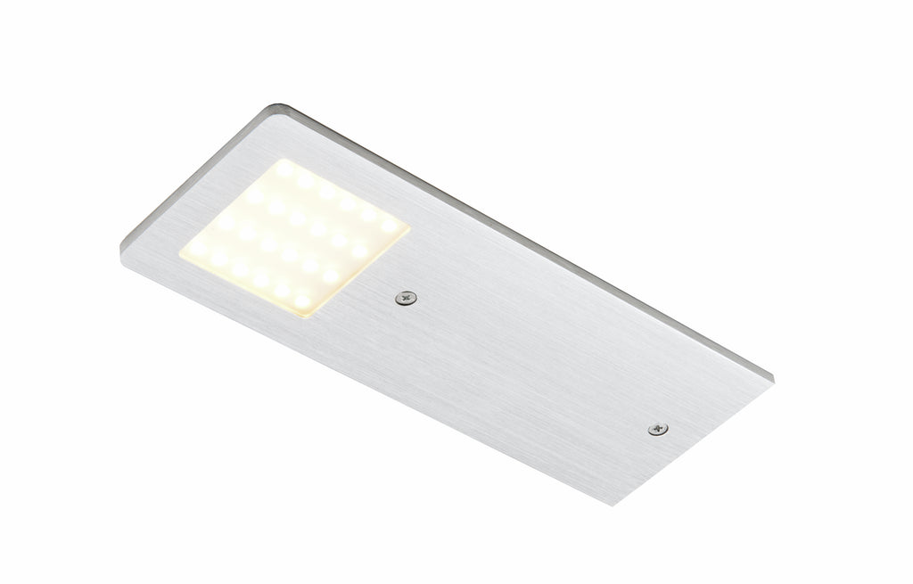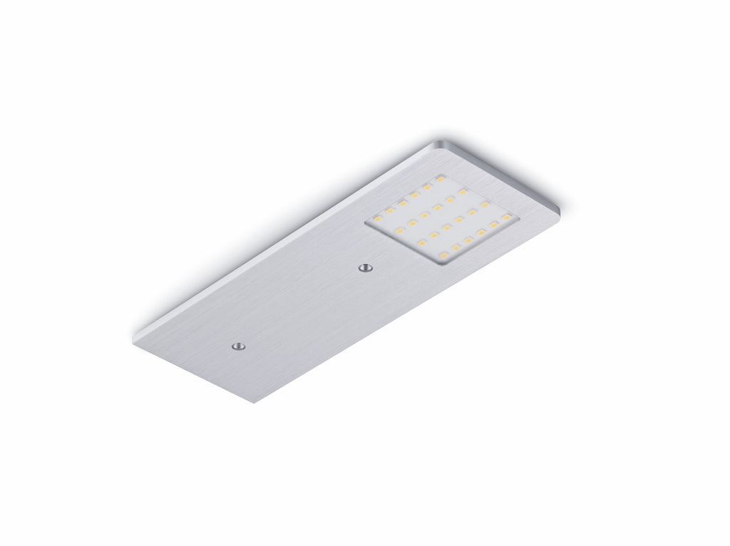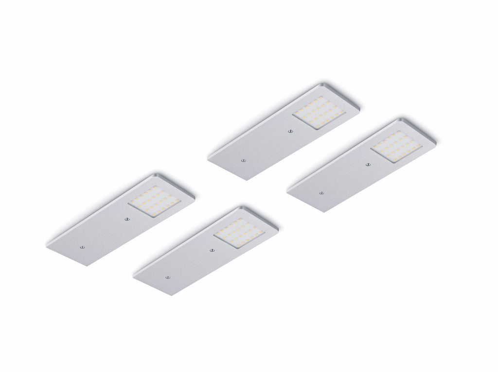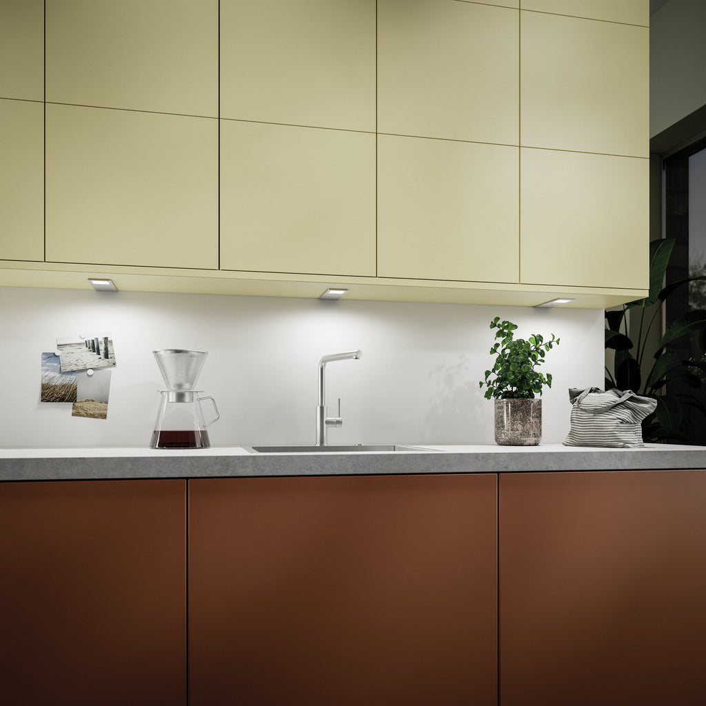 Die LUMICA® Unterbauleuchte AstraLED besticht mit einem modernen Design, das durch ein edles Aluminiumgehäuse unterstrichen wird. Dank der sehr flachen Bauweise mit nur 4 mm Höhe lässt sie sich perfekt an Unterböden der eingeplanten Hängeschränke integrieren. Die LED-Beleuchtung der Energieeffizienzklasse F bietet eine Lichtfarbe mit 3100 Kelvin bei 75 Lumen pro Watt. So entsteht eine warmweiße Lichtstimmung im Bereich der Küchenzeile. Die Unterbodenleuchte verfügt über eine Dimmfunktion. Dank der integrierten Memory-Funktion wird die letzte Einstellung gespeichert. Im Lieferumfang ist die benötigte Verbindungsleitung mit Ministecksystem und eine Zuleitung enthalten. Beide haben jeweils eine Länge von 2.000 mm. Die LED-Leuchte ist einzeln ohne Schalter und im praktischen Set mit vier Einzelleuchten, einem LED-Touch-Schalter, Dimmer sowie dem LUMICA® LED-Konverter 2430 erhältlich. Über die Bedienelemente kann die Helligkeit stufenlos reguliert werden.