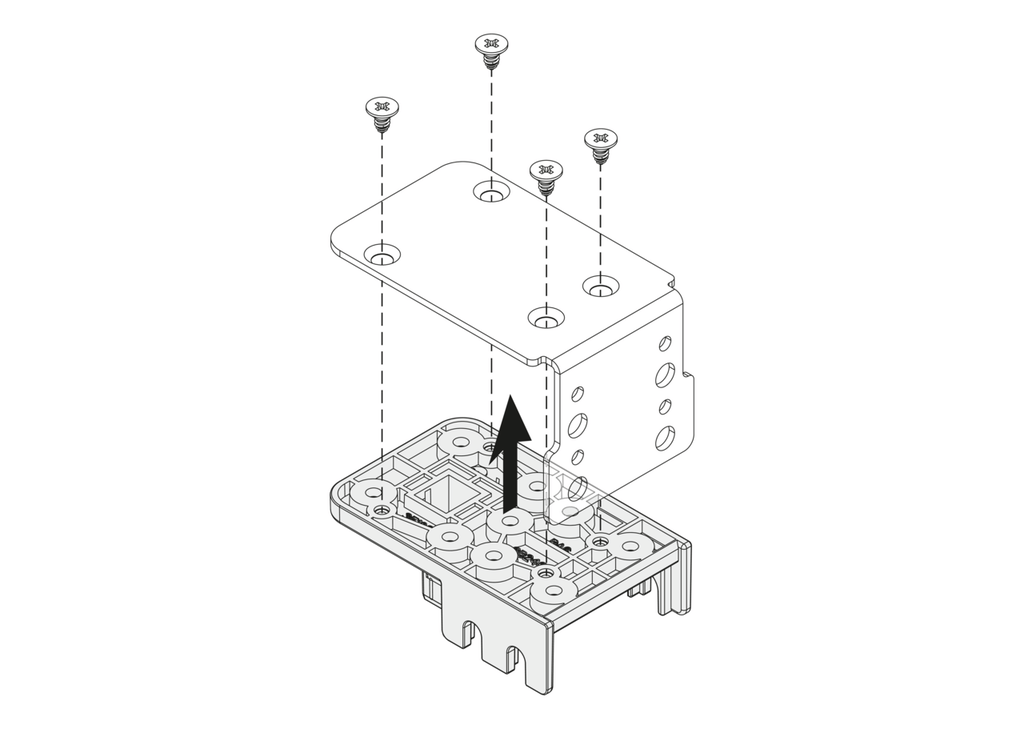 Systembauteil zur Befestigung des Eckschrank-Schwenkbeschlags bei der Verwendung einer Blindfront anstatt eines Mittelpfosten.