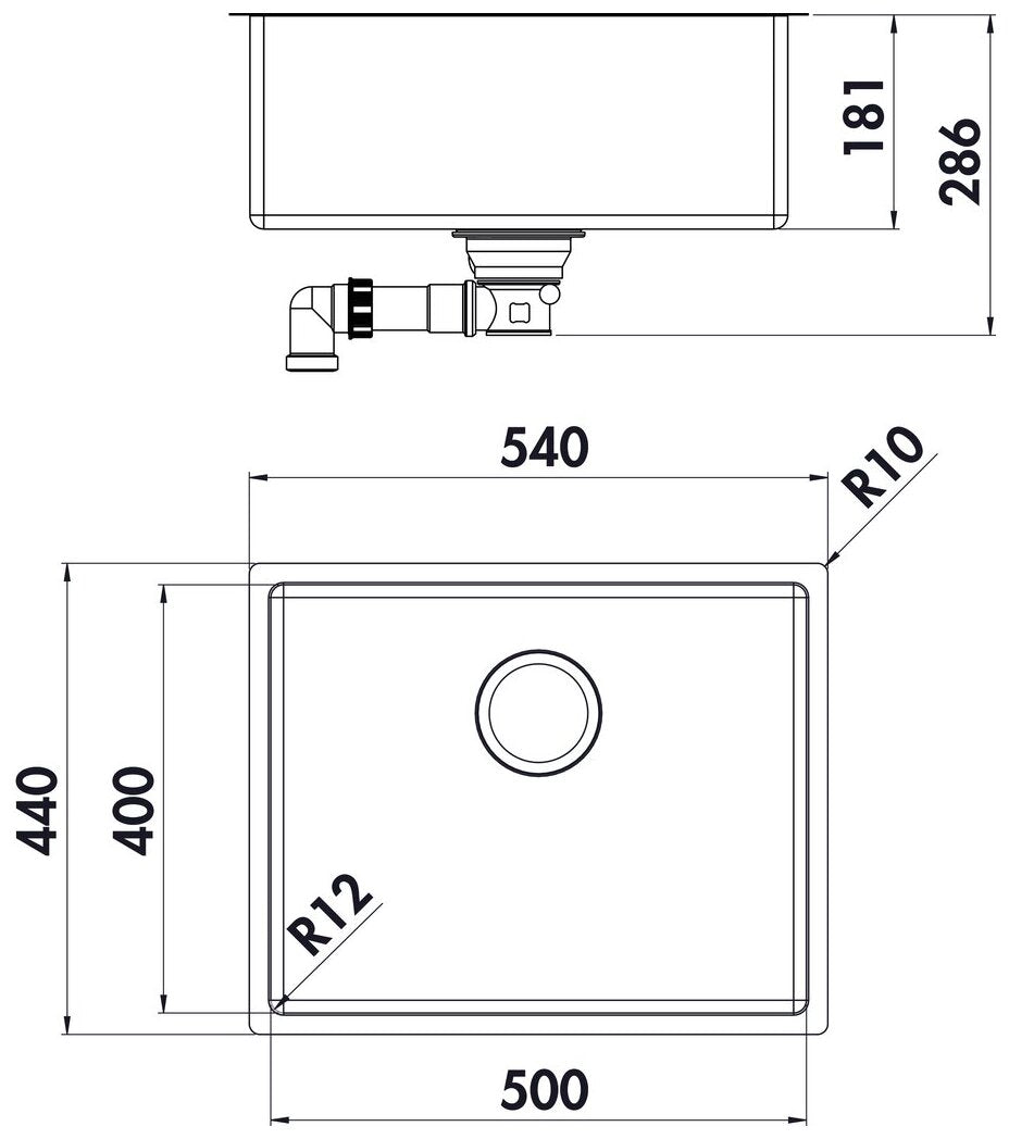 Einbau-/Unterbauspüle. Einzelbecken. 3½" Ab- und Überlaufgarnitur. Bei Verwendung der mitgelieferten Befestigungsklammern vergrößert sich die benötigte Einbaubreite je Seite um ca. 30 mm bei der Unterbauspüle.