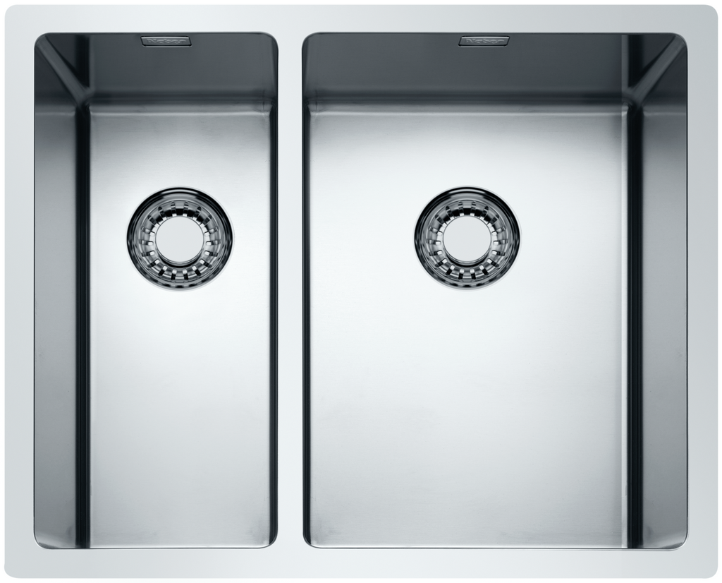 Einbau-/Unterbauspüle. Mit Restebecken. Beide Becken mit 3½" Ab- und Überlaufgarnitur und bodenbündigem Siebkorbventil. Bei Verwendung der mitgelieferten Befestigungsklammern vergrößert sich die benötigte Einbaubreite je Seite um ca. 30 mm bei der Unterbauspüle.