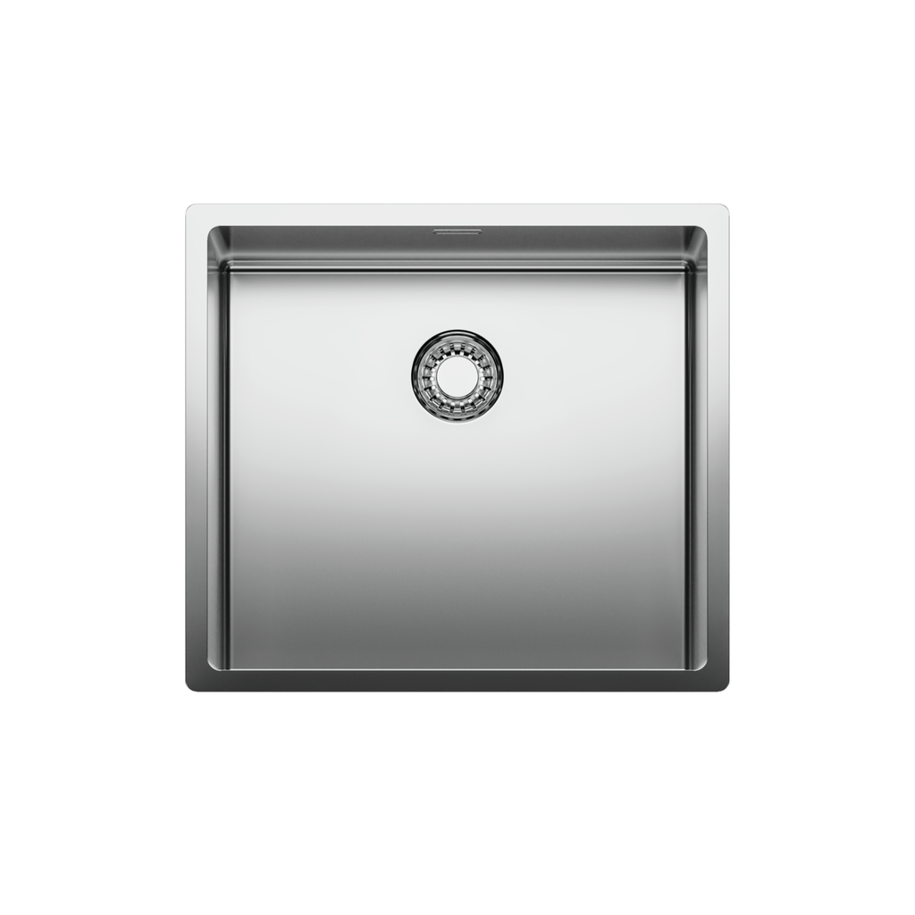 Einbau-/Unterbauspüle. Einzelbecken. 3½" Ab- und Überlaufgarnitur mit bodenbündigem Siebkorbventil. Bei Verwendung der mitgelieferten Befestigungsklammern vergrößert sich die benötigte Einbaubreite je Seite um ca. 30 mm bei der Unterbauspüle.
