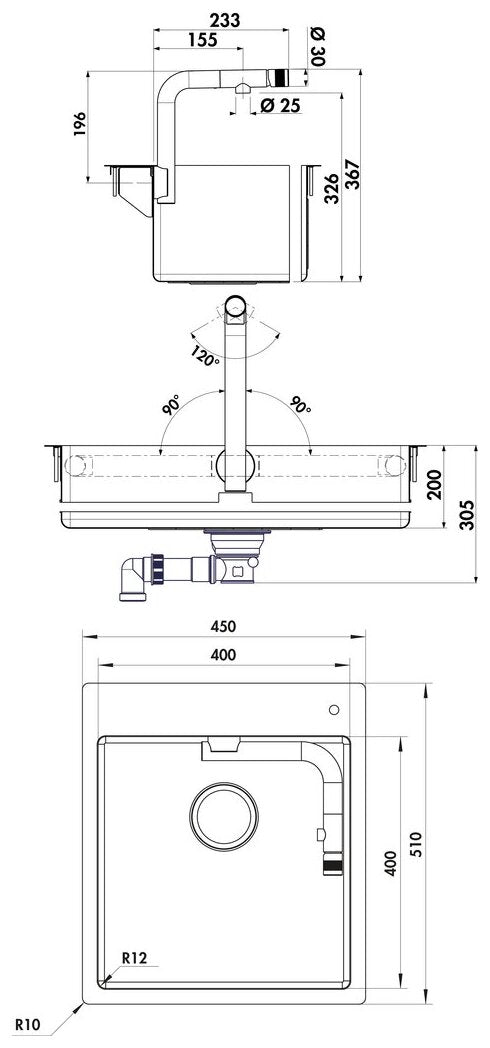 Auslauf 180° schwenkbar, Laminarstrahlregler 120° drehbar.