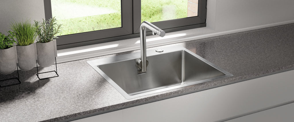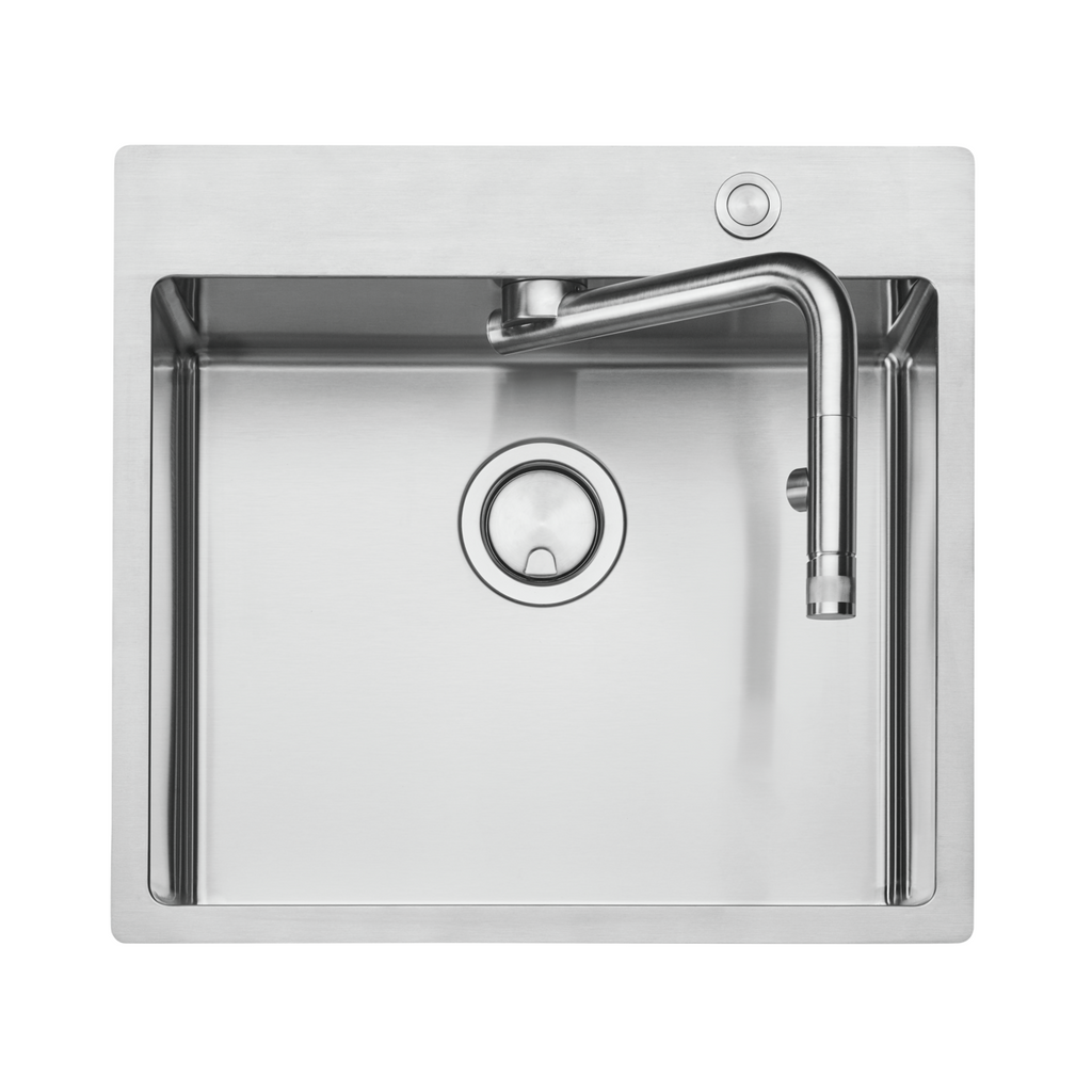 Die Einbauspüle Corno Turno 50 verbindet minimalistische Ästhetik und hohen Nutzungskomfort auf eine unverwechselbare Art. Basierend darauf, fügt sie sich harmonisch in moderne und klassische Küchenkonzepte. Als Innovation überzeugt der im Beckenrand integrierte Einhebelmischer mit einem eleganten Edelstahl-Finishing. Die Armatur lässt sich in einem Rahmen von 180° stufenlos schwenken. Der zugehörige Laminarstrahlregler ist bis 120° drehbar. Er sorgt dafür, dass sich im Wasserstrahl keine Luftverwirbelungen bilden, um die Anzahl der Spritztropfen beim Spülen und Säubern von Lebensmitteln deutlich zu verringern. Das Becken wird in exzellenter Qualität aus Edelstahl gefertigt. Die Ränder sind besonders flach verarbeitet, sodass eine flächenbündige Integration in die Küchenzeile möglich ist. Um mehr Platz für typische Vorbereitungsmaßnahmen zu erhalten, steht eine optional erhältliche Abdeckung zur Verfügung. Sie besteht aus zwei Teilen, sodass die Armatur in mittiger Position weiter nutzbar ist. Im Lieferumfang der Edelstahl-Einbauspüle ist das benötigte Siebkorbventil enthalten. Es wird über eine Druckknopfexzentergarnitur geöffnet und geschlossen.