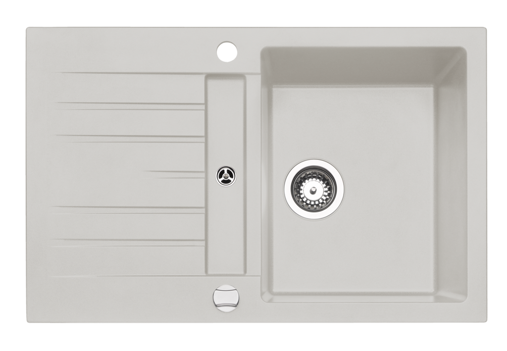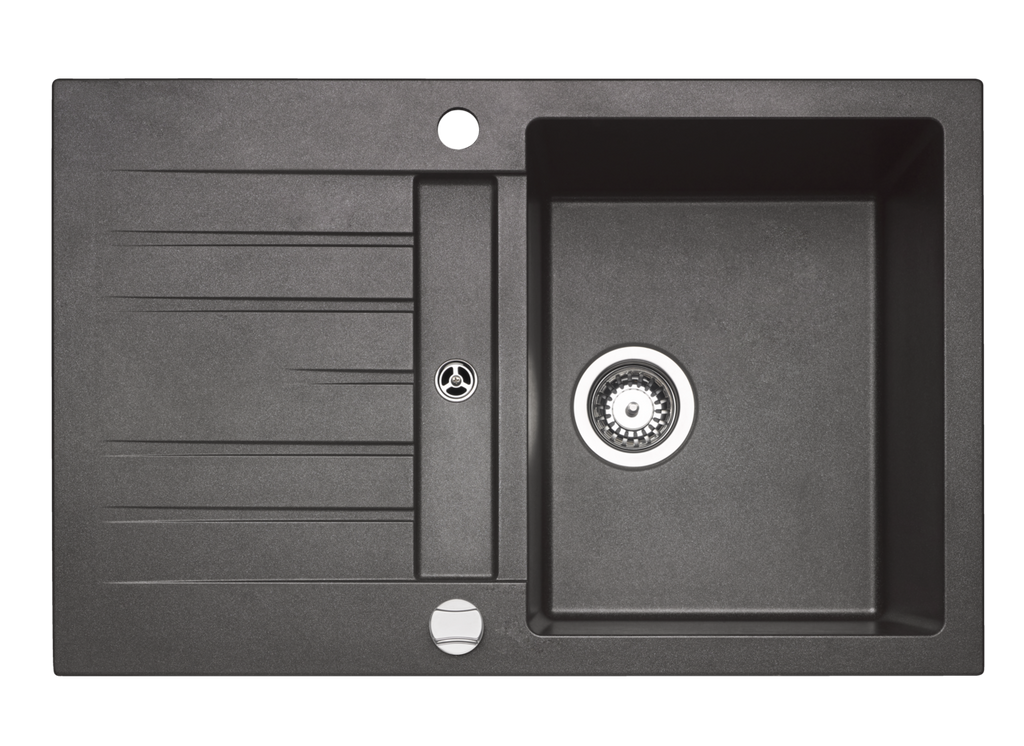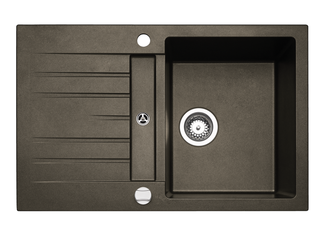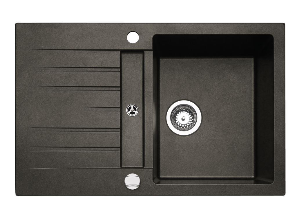 Einbauspüle. Composite, mit kleiner Abtropffläche, reversibel. 3½" Siebkorbventil mit Drehexzentergarnitur, verchromt.