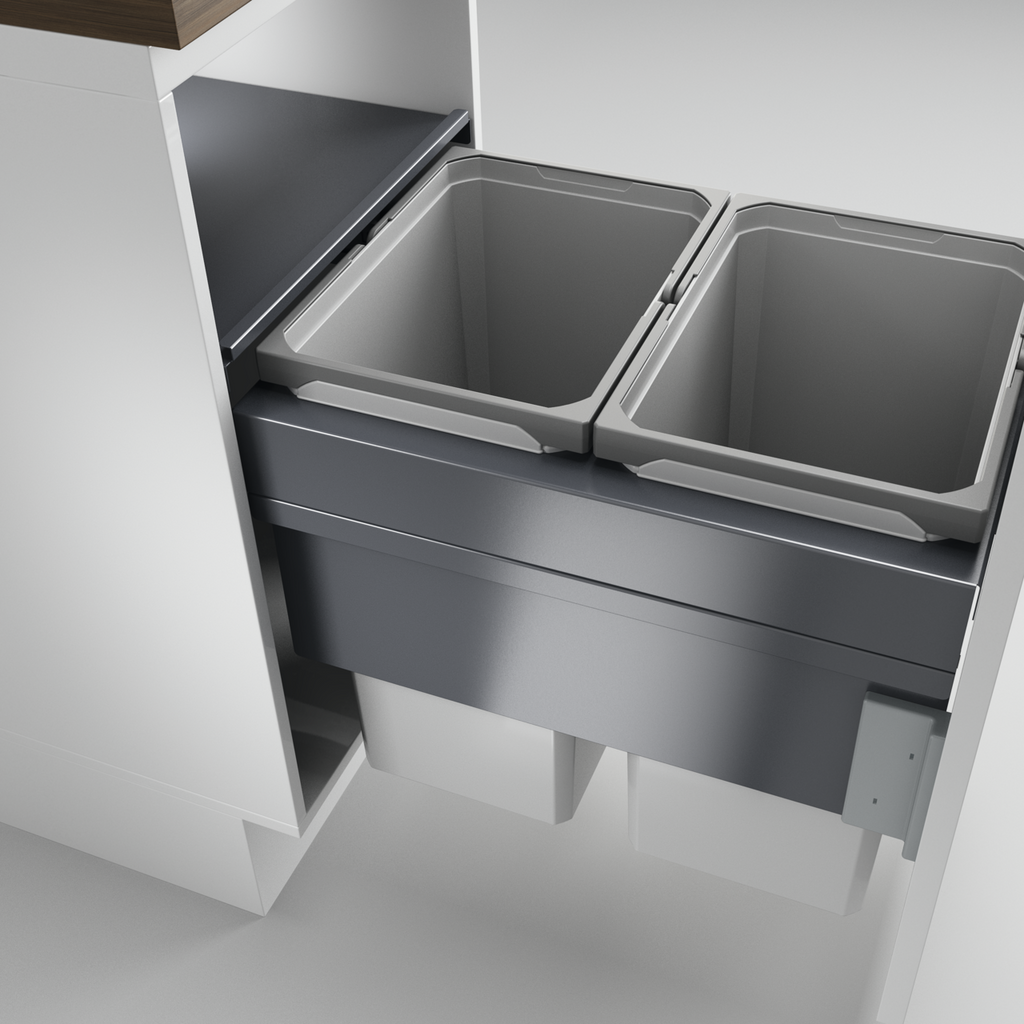 Das moderne Mülltrennsystem Cox Clan® 490/450-2 mit Überauszug besticht durch ein bequemes Handling bei der Abfallentsorgung in der Küche. Mit einem Abfallvolumen von insgesamt 59 Litern eignet es sich für Mehrpersonenhaushalte. Die beiden Behälter für die getrennte Aufbewahrung fassen jeweils 29,5 Liter. Zur Ausstattung gehört ein Gesamtdeckel aus beschichtetem Blech, der das Austreten von Gerüchen vermeidet. Er ist komplett herausziehbar und bietet sich als zusätzliche Ablagemöglichkeit für etwa Putzmittel oder Küchengeräte an. Zu den weiteren praktischen Features zählen der Softeinzug und eine Anschlagsdämpfung für ein sanftes und leises Schließen. Die Installation gestaltet sich mithilfe des quick&easy-Montagerahmens sehr einfach, wobei das Mülltrennungssystem an den Seitenwänden sowie an der Frontblende befestigt wird. Für individuelle Lösungen stehen innerhalb der Cox Clan® Serie Varianten in unterschiedlicher Einbaubreite und Höhe zur Wahl.