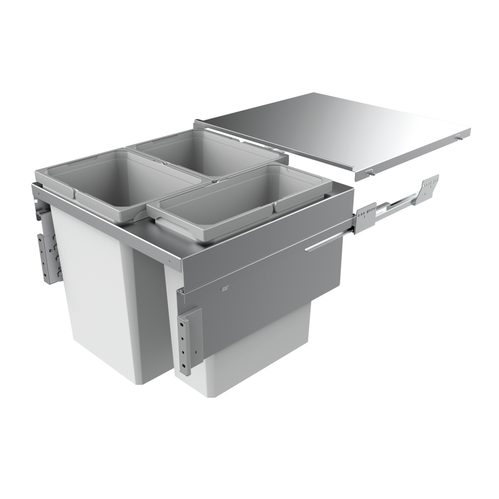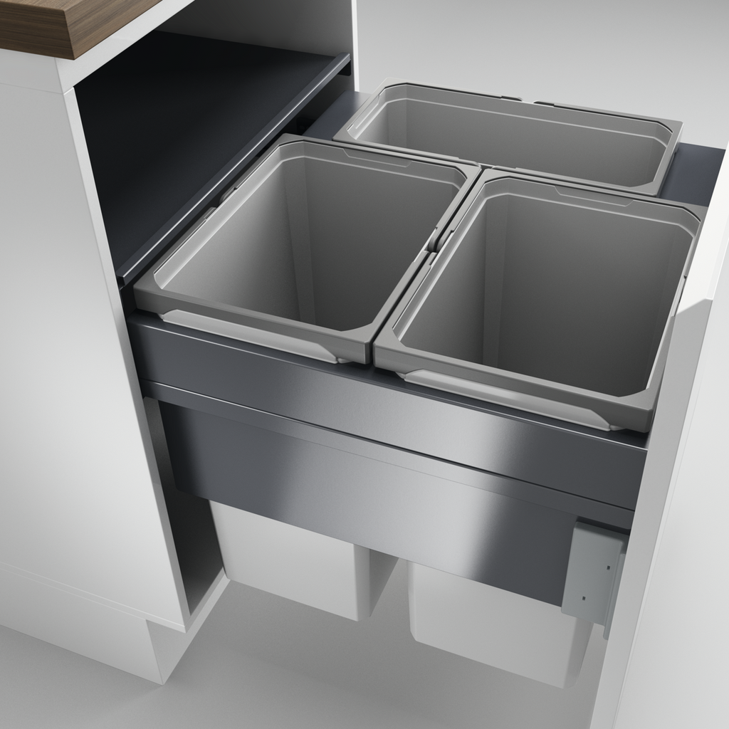 Mit einem großen Abfallvolumen von insgesamt 80 Litern überzeugt das Mülltrennsystem Cox Clan 490/600-3 in den Küchen großer Haushalte. Vorgesehen ist das Modell für 600 mm breite Unterschränke mit Frontauszug. Es ist ausgestattet mit drei herausnehmbaren Abfallbehältern die 2x 29,5 Liter und 1x 21 Liter fassen. Aus einem pulverbeschichteten Material besteht die stabile Abdeckung, die sich zugleich als Ablagefläche im Schrank nutzen lässt. Dank des Softeinzugs und der Anschlagdämpfung erfolgt das Einschieben des Systems leise und sanft. Zur Montage werden die Auszugsschienen und der Aufnahmebolzen für den Ablagedeckel an der Schrankwand befestigt. Komplettiert wird die Installation durch die Befestigung der Schrankfrontblende.