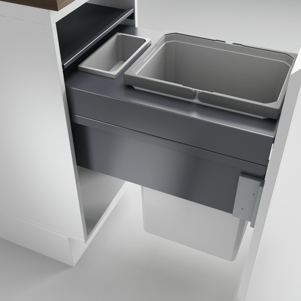 Mit einem großzügigen Abfallvolumen von insgesamt 36,2 Litern eignet sich das Mülltrennsystem Cox Clan 580/400-2 insbesondere für einen Mehrpersonenhaushalt. Es fügt sich mühelos in Küchenunterschränke mit Frontauszug und einer Korpusbreite von 400 mm. Dabei fällt direkt der stabile Metallrahmen auf, der als Träger für die beiden herausnehmbaren Abfallbehälter dient. Der 35 Liter große Mülleimer befindet sich vorne, während dahinter der kleinere Behälter mit 1,2 Liter Fassungsvermögen sitzt. Letzterer bietet sich besonders für Bio-Abfälle oder auch Küchenutensilien an. Verschlossen werden beide Behälter über einen robusten Gehäusedeckel, der aus pulverbeschichtetem Metall gefertigt ist. Er verbleibt im Schrank und lässt sich als zusätzliche Ablage nutzen. Weiter stellt das Modell einen Vollauszug zur Verfügung und schließt sich dank Softeinzug und Dämpfung ebenso automatisch wie leise. Die Montage erfolgt an den Schrankwänden und der Frontblende.