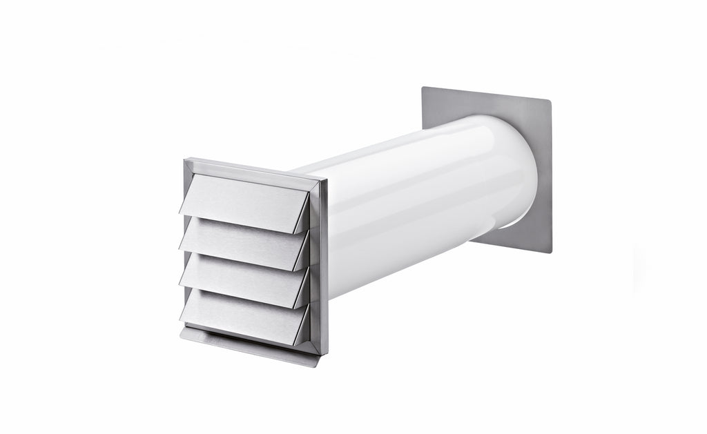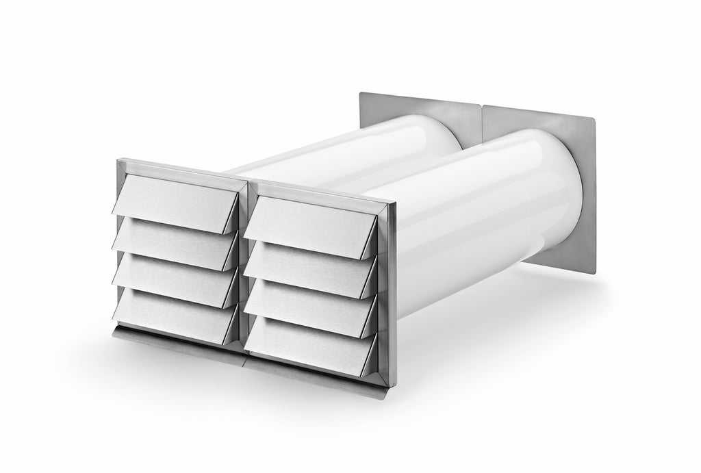 Zweiteiliger Mauerkasten mit separaten Abluft- und Zuluftelementen. Die beiden Edelstahl-Designaußenjalousien in moderner Lamellenoptik mit innen liegenden Rückstauklappen lösen auch räumlich schwierige Einbausituationen. Eine Edelstahl-Innenabdeckung des Abluftelements lässt sich über das Kunststoffrohr schieben und verdeckt sauber den Wanddurchbruch. Auf der Zuluftseite befindet sich ein Gitterauslass mit einem Aufnahmestutzen für das Rundrohr. Beide Elemente können als Set direkt nebeneinander oder auch als Einzelelement verwendet werden. Optimale Strömungswerte durch volumenstromgesteuerte Ab- und Zuluftöffnungen.