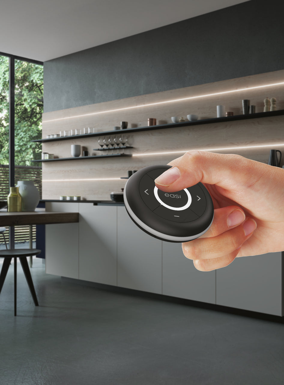 Die FB Funk-Fernbedienung EASi ermöglicht eine komfortable Steuerung Ihrer EASi-Beleuchtungssysteme. Mit einer kompakten Größe von 72 mm Durchmesser und 21 mm Tiefe liegt die Fernbedienung gut in der Hand und lässt sich dank der magnetischen Wandhalterung flexibel platzieren. Sie bietet Funktionen wie Ein-/Ausschalten, Gruppenwahlschaltung sowie stufenlose Helligkeits- und Farbtemperaturanpassung in drei Stufen (WHC3-Modus). Die Stromversorgung erfolgt über zwei im Lieferumfang enthaltene AAA-Batterien. Bis zu sieben Fernbedienungen können gleichzeitig mit einem oder mehreren FW-Funktionskonvertern EASi verbunden werden, um individuelle Lichtszenerien zu realisieren. Bitte beachten Sie, dass die Fernbedienung ausschließlich in Kombination mit dem FW-Funktionskonverter EASi verwendet werden kann. Ideal für moderne Küchen- und Wohnkonzepte, in denen flexible und smarte Beleuchtungslösungen gefragt sind.