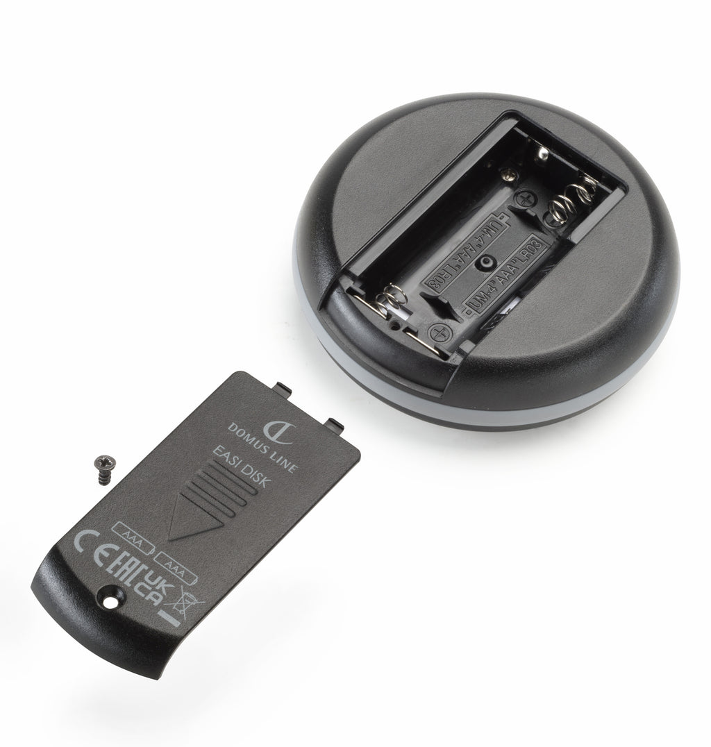 — Das Batteriefach der EASi DISK nimmt zwei mitgelieferte AAA Alkali-Mn-Ministifte auf.