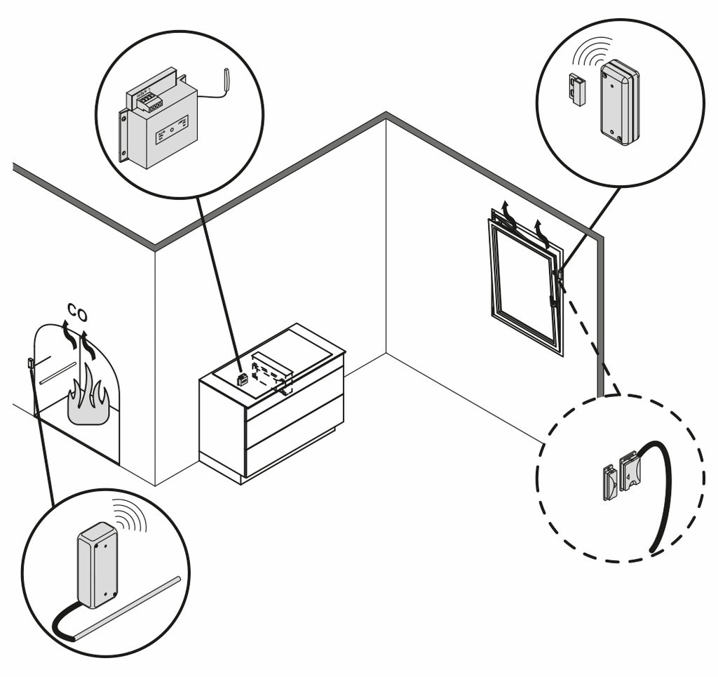 Sicherheitsschalter mit kabelloser Funkübertragung über eine externe Antenne für die Anwendung unter schwierigen Empfangsumständen, wie z.B. bei Montage hinter einer Verkleidung aus Edelstahl oder einem Möbelkorpus. Der Einbau in das Dunstabzugssystem erfolgt über den Anschluss an die Lüftermotor-Zuleitung (Motorzuleitung)