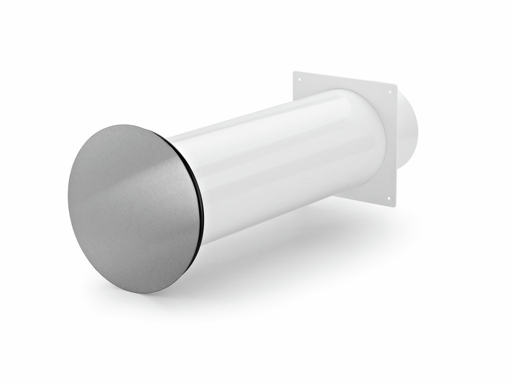 Mit Anschluss an Rundrohr-Ø 150 mm und runder Edelstahlaußenabdeckung.