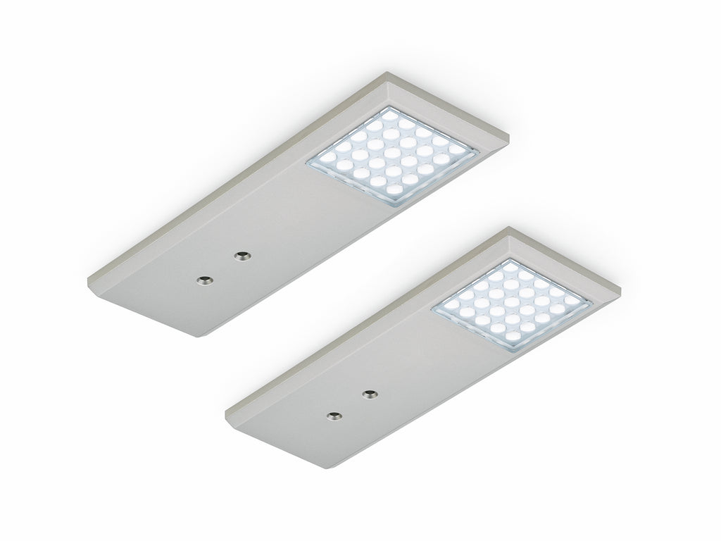 Für moderne Beleuchtungssysteme in der Küche: die 2 Watt Unterbauleuchte Intorno L Farbwechsel LED in eleganter Ausführung. Mit einer Bauhöhe von nur 8 mm lässt sie sich problemlos am Boden der Hängeschränke befestigen und eignet sich ebenso für den Einsatz als Nischenleuchte. Die Regulierung der Lichtfarbe erfolgt stufenlos in einem Bereich von 2700 K bis 6500 K bedarfsgerecht von kaltweißer bis warmweißer Beleuchtung. Darüber hinaus lässt sich die Helligkeit der 25 Power-LEDs ebenso stufenlos regulieren. Dank der integrierten Memory-Funktion wird die letzte Einstellung vor dem Ausschalten automatisch abgespeichert. Die Unterbodenleuchte ist als Einzelleuchte ohne Schalter sowie im Set mit zwei oder 3 Leuchten inklusive Farbwechsel LED Touch Schalter und Dimmer erhältlich. Der für den Betrieb mit einer Spannung von 24 V benötigte LED-Konverter ist ebenfalls im Set enthalten. Das System ist auf bis zu 6 Einzelleuchten erweiterbar.