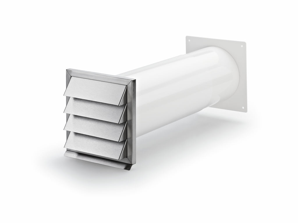 Der COMPAIR® flow Klima-E 150 Mauerkasten wird in der Wand eingebaut, um die Abluft aus der Küche über einen Luftkanal kontrolliert nach außen zu leiten. Sein COMPAIR® flow System mit Leitkörper-Technologie hat eine hohe Luftleistung und führt den Wrasen mit minimalen Druckverlusten leise um die Kurven nach draußen. Zum Anschluss ist der Abluft-Mauerkasten mit einem Rundrohr ausgestattet. Mit einem Durchmesser von 150 mm wird ein Wanddurchbruch von ca. 155 mm benötigt. Durch das Teleskoprohr kann die Länge der Durchführung nach dem individuellen Bedarf von 420-620 mm angepasst werden. Die Länge des Rohres lässt sich bis auf 175 mm kürzen. Um das Eindringen von Luft oder Gerüchen aus dem Außenbereich zu verhindern, verfügt der Teleskop-Mauerkasten über eine Rückstauklappe. Eine hochwertige Außenjalousie rundet die Mauerdurchführung ab und gewährt einen Schutz vor Witterungseinflüssen. Das schicke Lamellendesign aus Edelstahl wird nicht nur optischen Ansprüchen gerecht, sondern zeichnet sich auch durch eine hohe Stabilität und Langlebigkeit aus.