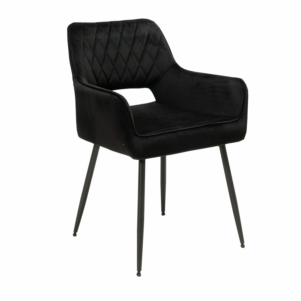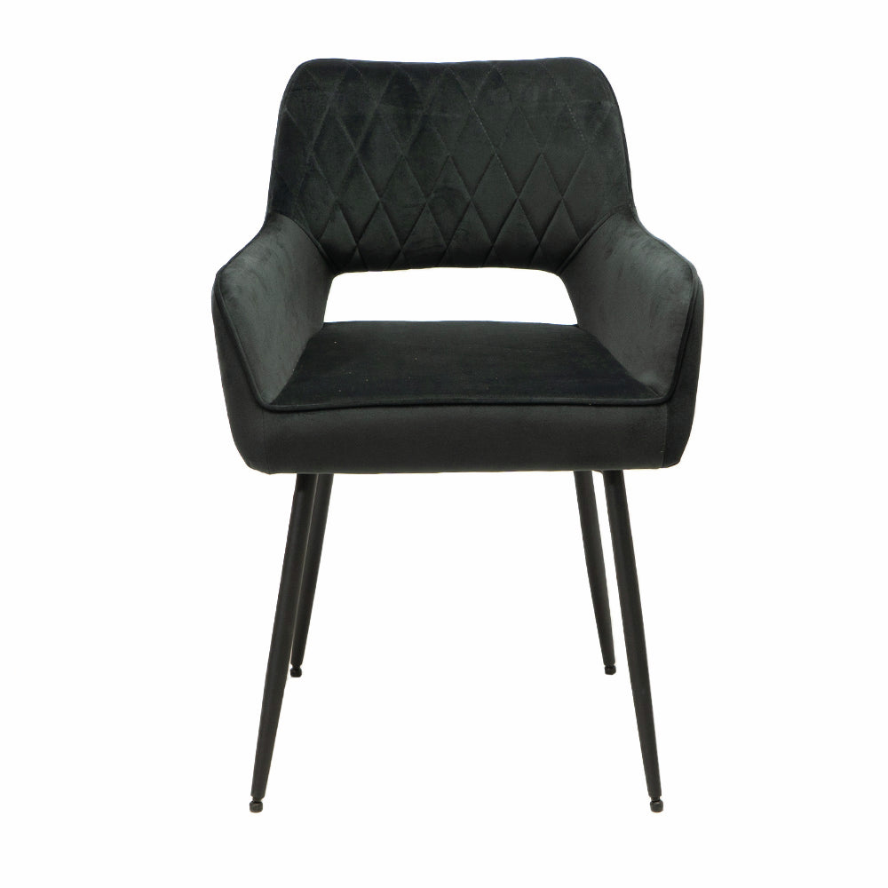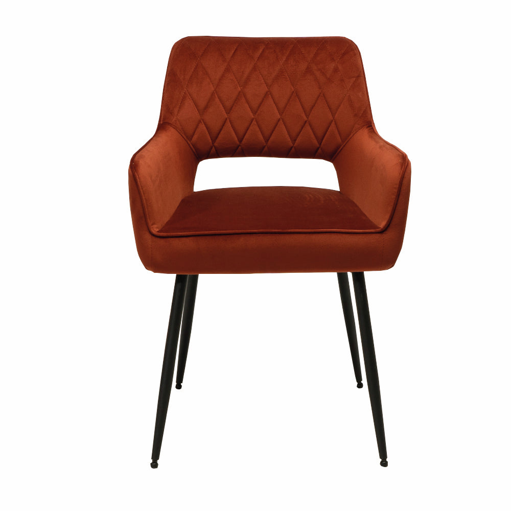 Der Armlehnenstuhl Lera 1V setzt einen attraktiven Designakzent in Küche und Esszimmer. Er zeichnet sich durch einen modernen Look aus und fällt durch seine offene Rückenlehne mit Rautenmuster auf. Mit seiner Samtoptik schafft der Küchenstuhl ein stilvolles Ambiente in der Einrichtung. Durch seine Armlehnen und die bequeme Sitzfläche bietet er einen angenehmen Komfort für gemütliche Abendessen. Der verwendete Samtstoff für Sitz und Rückenlehne besticht durch wasserabweisende Eigenschaften und lässt sich pflegeleicht reinigen. Da der Stuhl in vielen Farbvarianten bestellbar ist, lässt er sich perfekt auf die vorhandene Kücheneinrichtung abstimmen.