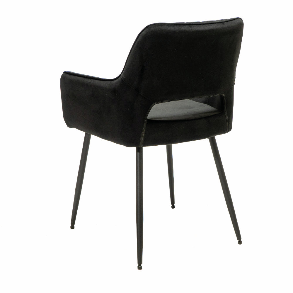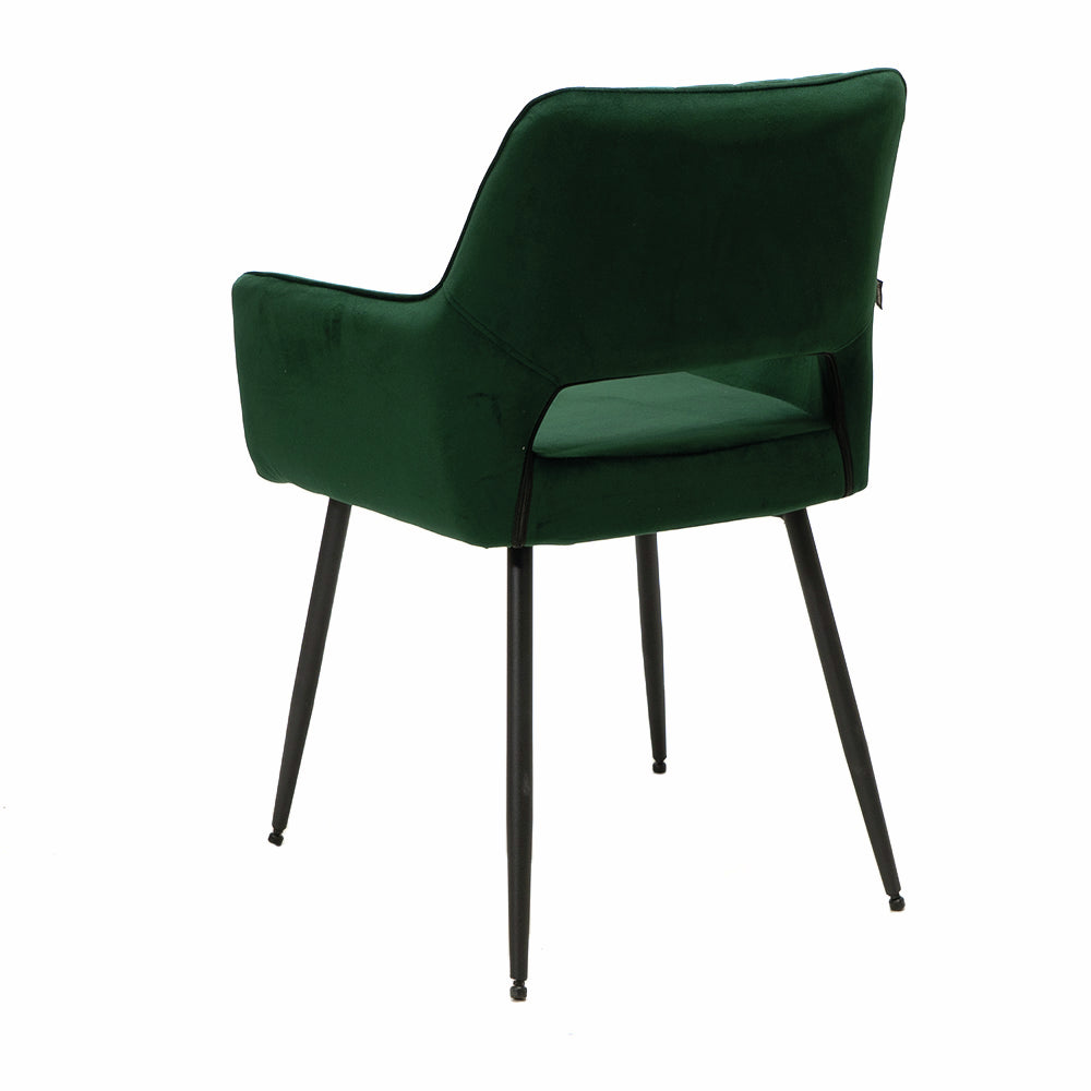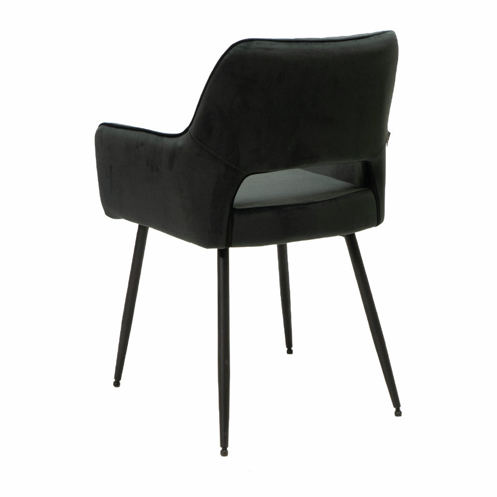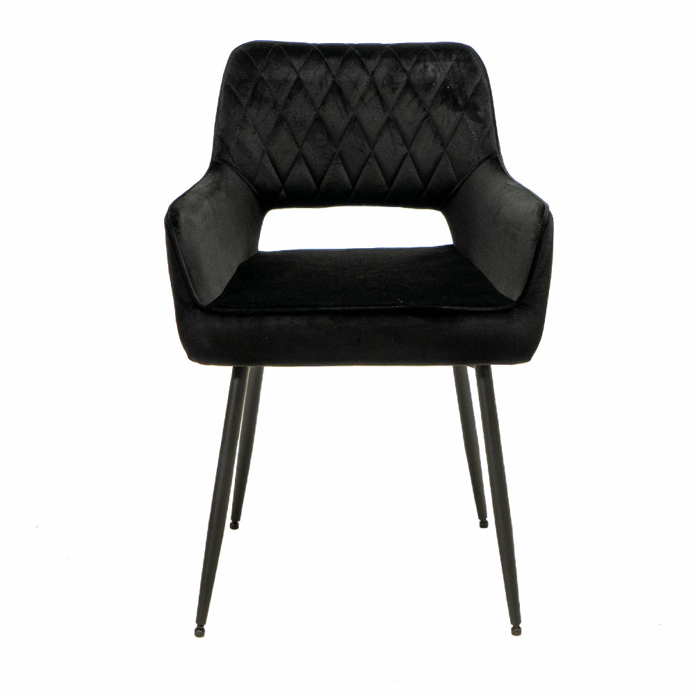 Der Armlehnenstuhl Lera 1V setzt einen attraktiven Designakzent in Küche und Esszimmer. Er zeichnet sich durch einen modernen Look aus und fällt durch seine offene Rückenlehne mit Rautenmuster auf. Mit seiner Samtoptik schafft der Küchenstuhl ein stilvolles Ambiente in der Einrichtung. Durch seine Armlehnen und die bequeme Sitzfläche bietet er einen angenehmen Komfort für gemütliche Abendessen. Der verwendete Samtstoff für Sitz und Rückenlehne besticht durch wasserabweisende Eigenschaften und lässt sich pflegeleicht reinigen. Da der Stuhl in vielen Farbvarianten bestellbar ist, lässt er sich perfekt auf die vorhandene Kücheneinrichtung abstimmen.