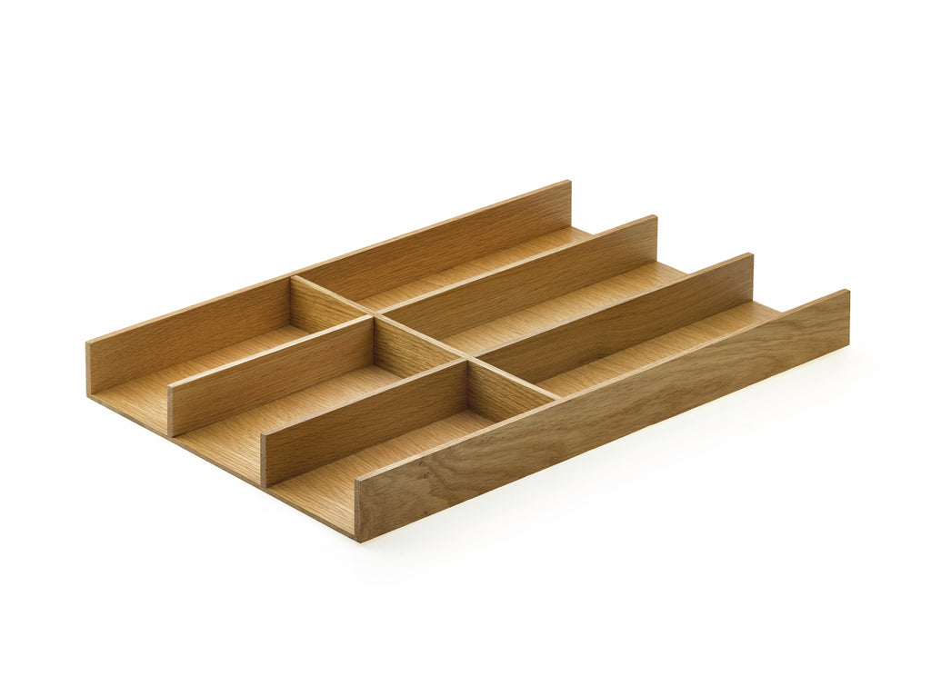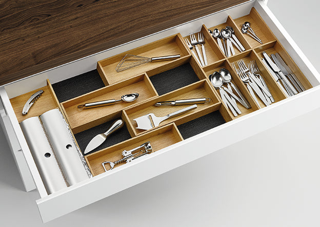 Die Schubladeneinsätze Modify Set 1000 mit Folienhalter bieten vielfältige Aufbewahrungsmöglichkeiten für Küchenutensilien. Während im Besteckeinsatz, Multifunktionseinsatz und in den vier Schalen das Besteck und Küchenhelfer verstaut werden können, eignet sich der Folienhalter zur ordentlichen Unterbringung von Alufolie und Frischhaltefolie. Um ein Verrutschen in der Küchenschublade zu verhindern, wird der Schubladeneinsatz mit einer praktischen Antirutschmatte geliefert. In zeitloser Holzoptik gestaltet, lässt er sich in jeden Küchenstil integrieren. Nach dem individuellen Geschmack stehen unterschiedliche Farben zur Auswahl.