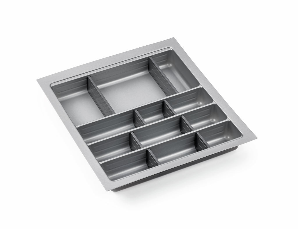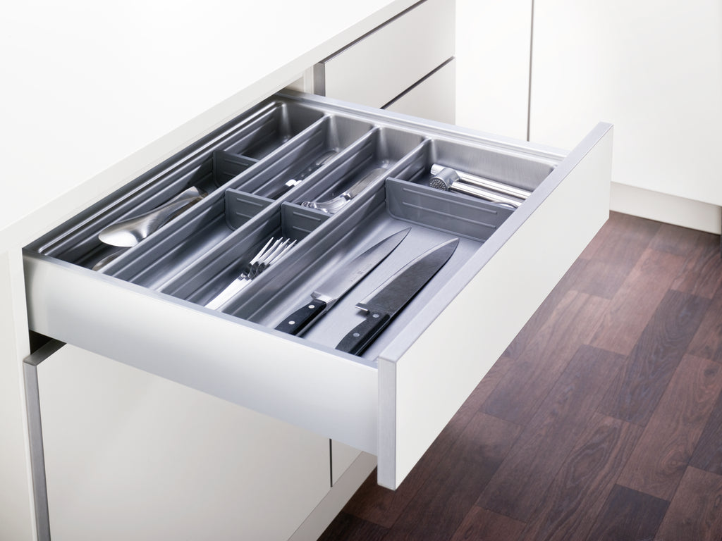 Der Besteckeinsatz Ordine ist ein praktischer Helfer für eine bessere Organisation in der Küchenschublade. Um Messer, Gabel und Löffel gut sortiert aufzubewahren, ist er mit mehreren Fächern ausgestattet. Da die Trennstege flexibel eingesetzt werden können, sind individuelle Facheinteilungen möglich. Dank der Quereinteilung stoßen die Küchenutensilien nicht bei jedem Öffnen gegen das Material, wodurch dieses geschützt wird. Für eine pflegeleichte und langlebige Qualität sind die Trenner aus Kunststoff hergestellt. Damit die Besteckablage passgenau in die Schublade integriert werden kann, lässt sich der Rand zuschneiden. Die Montage erfolgt mittels Einklicken der seitlichen Führungsnut schnell und einfach. Mit seiner edelstahlfarbigen Optik fügt sich der Besteckorganizer in jedes Küchenkonzept ein.