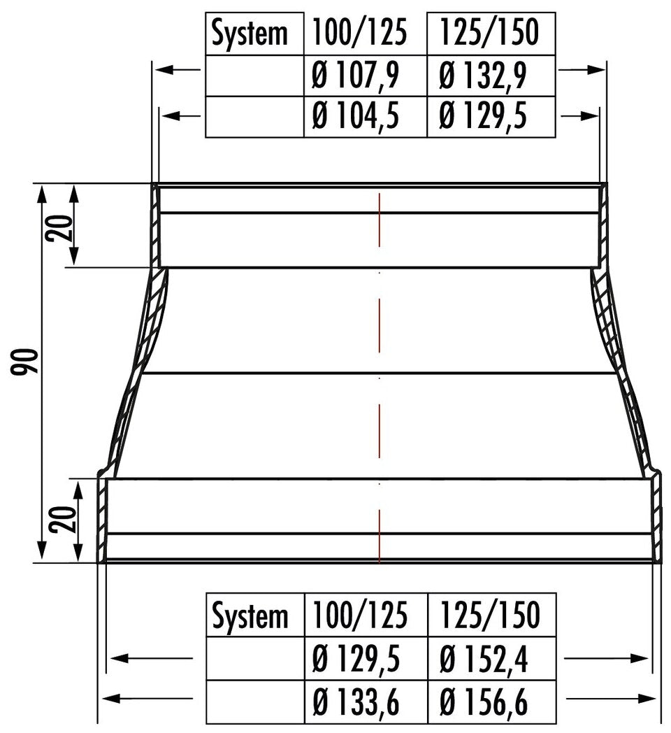 Für den Übergang von Ø 125 mm auf Ø 100 mm Rundrohr oder Ø 150 mm auf Ø 125 mm Rundrohr. Reversibler Einbau möglich. Strömungsoptimierte Ausführung durch Vermeiden von scharfkantigen Strömungsabrissen.