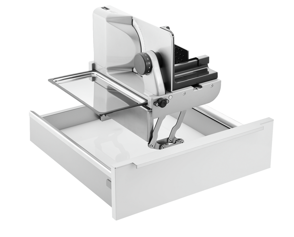 Eine platzsparende Lösung für die Speisenvorbereitung: der ritter Allesschneider AES 62-H zum Schneiden von Brot, Wurst, Obst und Gemüse. Extra hoch konstruiert, passt er zu Küchenzeilen mit besonders dicker Arbeitsplatte und ist ebenso für den Einbau in Schubkästen mit griffloser Front geeignet. Sobald dieser geöffnet wird, klappt der Multischneider auf, wobei der Aufstellbeschlag selbsttätig verriegelt wird. Der zum Set gehörende Energiesparmotor ist mit 65 W leistungsstark und langlebig. Als Betriebsmodi stehen ein Moment- und Dauerschalter zur Verfügung. Mit einem Wellenschliff ausgestattet, zeichnet sich das zugehörige Rundmesser mit einem Durchmesser von 170 mm durch präzise Schnittergebnisse bis zu 14 mm aus. Für ein hohes Maß an Sicherheit bei der Bedienung wird durch die Einklappsperre bei eingestellter Schnittstärke gesorgt. Die Entnahme und der Wechsel des Messers erfolgt mithilfe des Bajonettschnellverschlusses werkzeuglos. Der Brotschneider wird in robuster Ausführung aus Metall gefertigt und hat eine 5 Jahre-Herstellergarantie. Als praktisches Zubehör sind eine Schneidgut-Auffangschale aus rostfreiem Edelstahl inklusive Befestigung sowie ein Haltewinkel für den Fingerschutz im Lieferumfang enthalten.