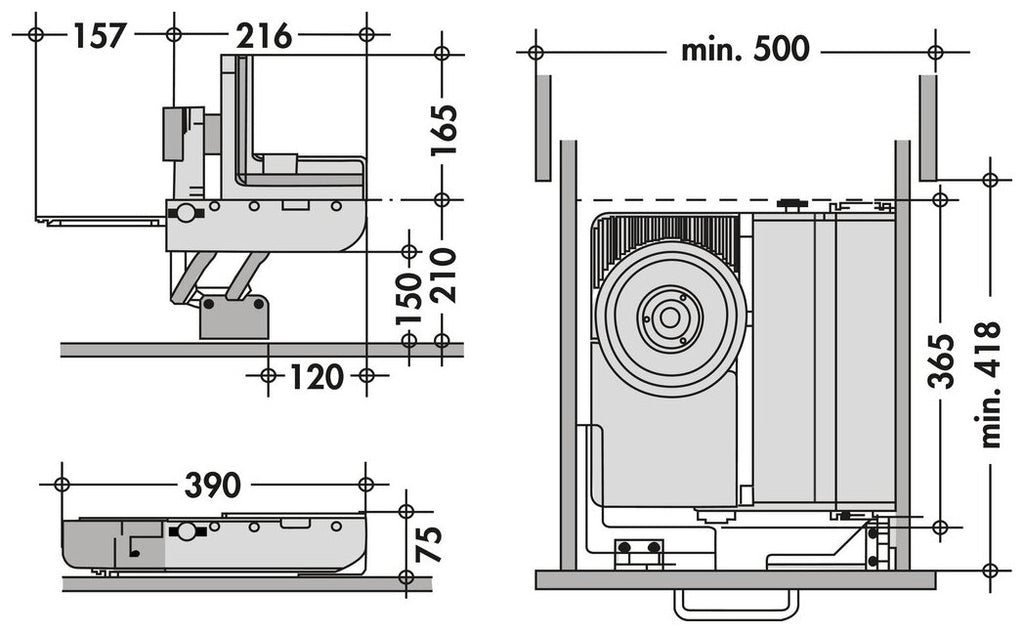 Abstand Schubkastenboden bis Arbeitsplattenoberkante min. 165 mm, max. 210 mm. Besonders geeignet für grifflose Küchen oder dickere Arbeitsplatten.