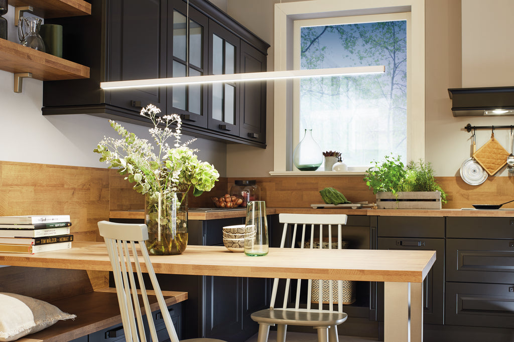 Über dem Küchentisch oder der Kücheninsel angebracht, schafft die Pendelleuchte Slim LED ein behagliches Ambiente im Raum und setzt gemütliche Lichtakzente. Mit ihrem eleganten, schlanken Design und ihrem Materialmix aus Aluminium und Acrylglas verleiht sie der Küche eine stilvolle Note. Zur Beleuchtung dient die LED-Technologie, die durch eine geringe Wärmeentwicklung und niedrigen Stromverbrauch besticht. Dank der integrierten Dimmfunktion lässt sich die Helligkeit nach den persönlichen Vorlieben stufenlos dimmen. Auch die Lichtfarbe kann bequem durch die mitgelieferte Fernbedienung von einem behaglichen Warmweiß (2700 K) bis zu einem hellen Kaltweiß (6500 K) eingestellt werden. Dank der Memoryfunktion bleibt die zuletzt ausgewählte Einstellung auch nach erneutem Einschalten der Leuchte erhalten. Ein Konverter ist bereits im Lieferumfang enthalten. Die Pendelleuchte kann passend zum vorhandenen Einrichtungsstil in unterschiedlichen Farbvarianten ausgewählt werden.