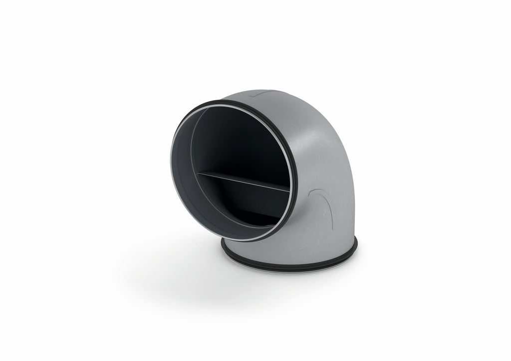 Der vertikale COMPAIR® STEEL flow SR-RBV 150 Rohrbogen ermöglicht eine eckennahe Verlegung des Lüftungskanals durch seinen geringen Innenradius von nur 127 mm. Das 90°-Verbindungselement ist kompatibel mit den Rundrohren SR-R flex und SR-R aus der COMPAIR® STEEL flow Serie und dient ebenfalls zum Anschluss von Kunststoff-Rundrohren des Durchmessers 150 mm. Es ist mit Luftleitkörpern ausgestattet, die einem Strömungsverlust entgegenwirken. Ferner integriert es beidseitige Dichtlippen. Gefertigt ist das Lüftungsformteil aus verzinktem Stahl, wodurch es hohen Brandschutzauflagen gerecht wird.