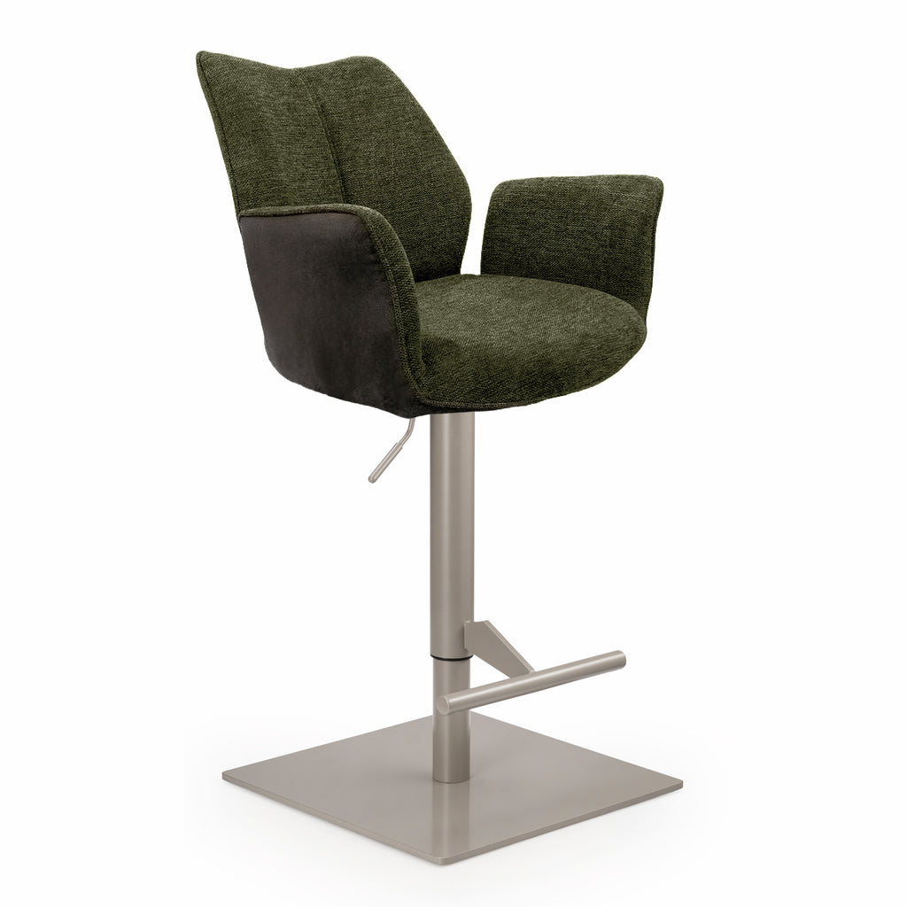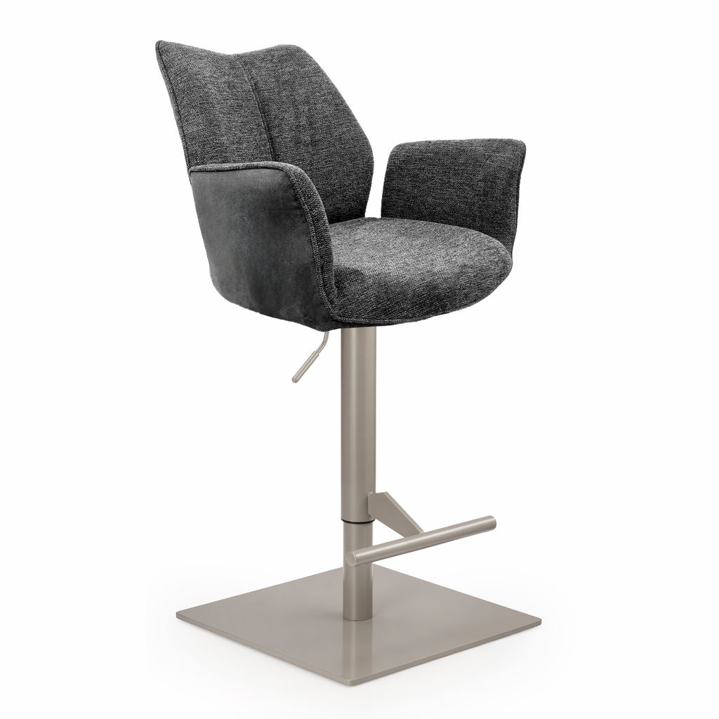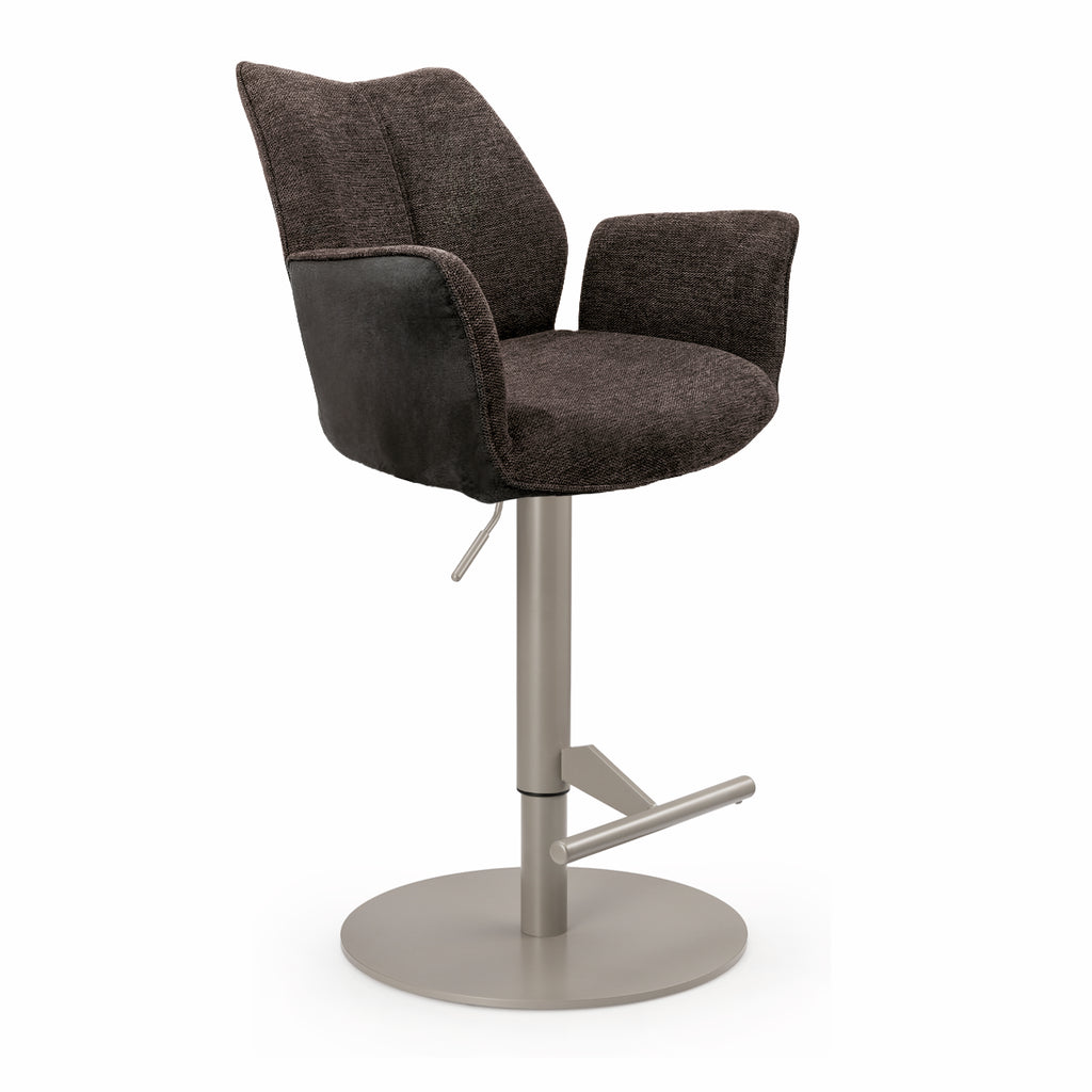 Eine gemütliche Sitzgelegenheit und zugleich attraktiver Hingucker für Kücheninsel, Hausbar und Stehtisch ist der Barhocker Stella AS. Sein schlankes Gestell mit Bodenplatte und die formschöne Rückenlehne verleihen ihm einen modernen Look. Auch der schöne Materialmix mit Stoff an der Vorder- und Kunstleder an der Rückseite sorgt für einen attraktiven Hingucker. Mit seinen bequemen Armlehnen und der gepolsterten Sitzfläche und Rückenlehne mit Wellenunterfederung bietet der Sitzhocker einen hervorragenden Komfort. Da er um 360° drehbar ist, gewährt er eine maximale Bewegungsfreiheit beim Sitzen. Dank der variablen Höhenverstellung lässt sich der Hocker an die individuellen Sitzbedürfnisse und Tischhöhe anpassen. Sein Gestell aus Stahl sorgt für eine hohe Robustheit und ist langlebig. Durch verschiedene Farbausführungen bietet der Barstuhl Spielraum für die Umsetzung von persönlichen Einrichtungsideen.