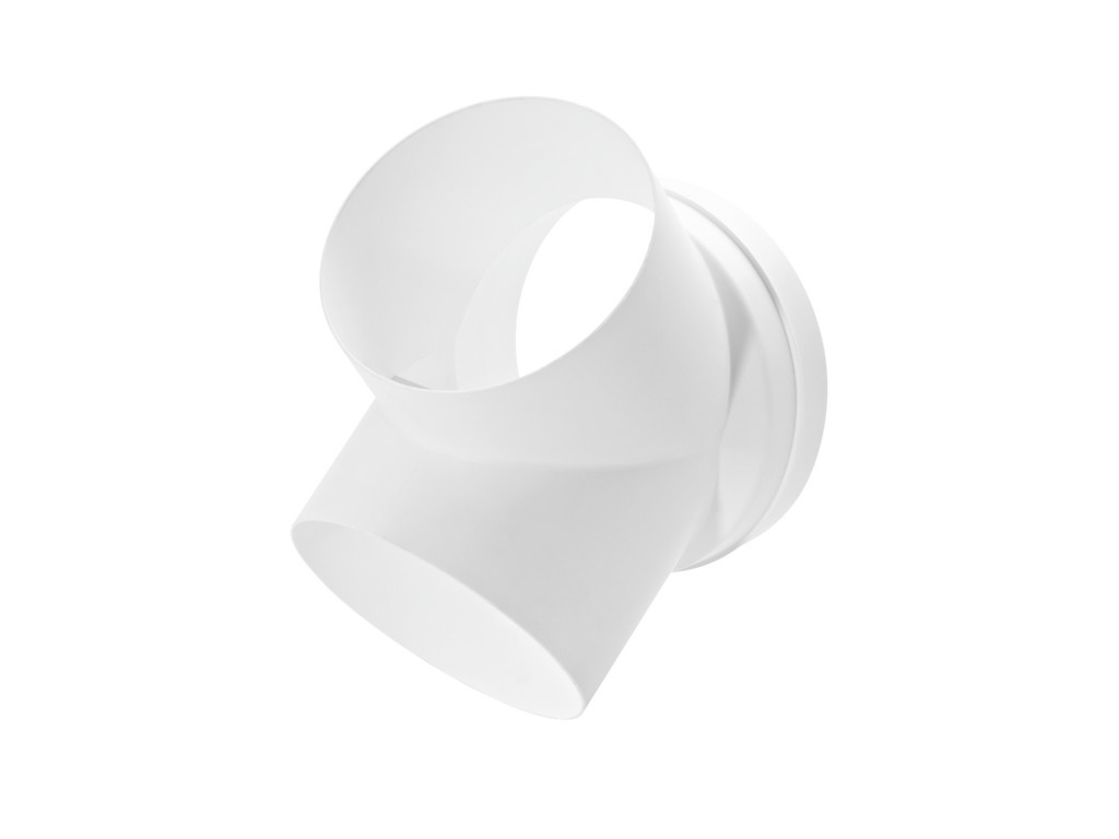 ® top T-HS 125 Hosenstück ermöglicht eine Teilung des Abluftkanals bei geringem Platzbedarf. Es führt zwei runde Abluftrohre aus unterschiedlichen Richtungen zusammen und leitet sie in einen einzigen Rundkanal weiter. An dem Y-Verbindungsstück können zwei Rundrohre des Durchmessers 125 mm angeschlossen werden. Der Querschnitt der dritten Verbindung beläuft sich auf 150 mm bei einer Stutzentiefe von 30 mm. Das integrierte Raster erlaubt einen Anschluss von Rundrohren oder Flexkanälen. Gefertigt ist das Lüftungsformteil aus langlebigem Polystyrol-Kunststoff.