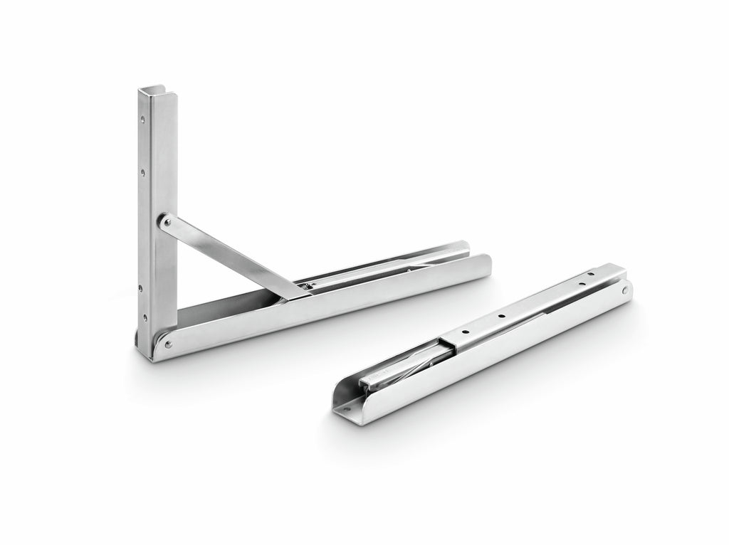 Die Vettore Klappkonsole zeichnet sich durch ein modernes Design und funktionale Ausstattungsmerkmale aus. Paarweise genutzt, dient sie der Aufnahme einer Arbeits- oder Tischplatte in der Küche. Der Handlungsspielraum wird durch dreifach rastbare Positionswinkel erweitert. Hinzu kommt die hohe Tragfähigkeit mit einer Belastbarkeit bis 100 kg, sodass sie die Basis für die Abstellmöglichkeit verschiedener Küchengeräte wie etwa eine Mikrowelle bildet. Die Stützkonsole wird in solider Qualität mit verzinkten Oberflächen gefertigt, die sich als strapazierfähig erweisen. Für eine sichere und einfache Montage stehen jeweils vier Befestigungspunkte zur Wand und für die Platte zur Verfügung. Unterschiedliche Größen ermöglichen individuelle Lösungen.