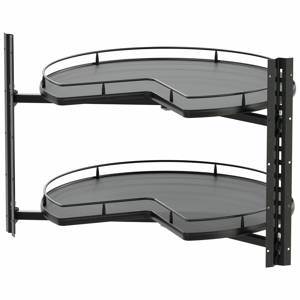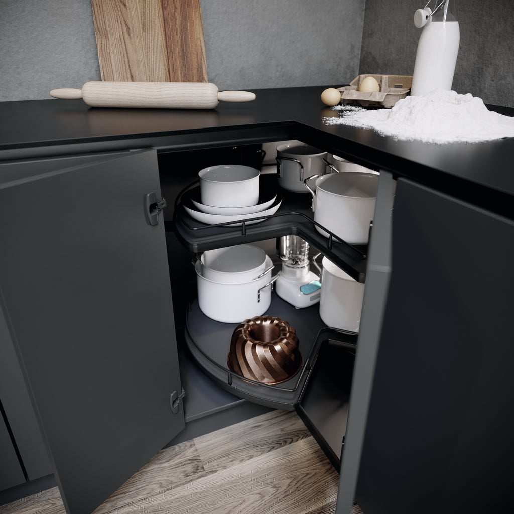 Der Eckschrank-Drehbeschlag VS COR Wheel Pro für diverse Tablarvarianten schafft optimale Voraussetzungen, um die in Kücheneckschränken vorhandenen Aufbewahrungsmöglichkeiten effizient zu nutzen. Bei der Konstruktion der Eckschrankausstattung wurde bewusst auf das sonst übliche Mittelrohr verzichtet, sodass bis zu 20 % mehr Stauraum in der Tablarmitte zur Verfügung steht. Optisch fügt sich die Schrankausstattung harmonisch ein, da die für die Nutzung benötigte Mechanik unsichtbar integriert wird. Die Ablageböden lassen sich werkzeuglos auf den Tragarmen platzieren und sind pro Ebene bis 27,5 kg belastbar. Es ist genügend Spielraum zum Aufbewahren des Kochgeschirrs aus Edelstahl und weiterer Küchenutensilien vorhanden. Die moderne Unterschrankausstattung steht in unterschiedlichen Varianten für ¾ und 4/4 Tablare zur Verfügung.